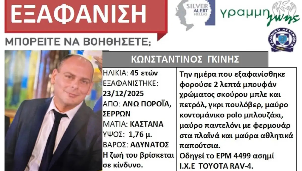 Σε πλήρη εξέλιξη βρίσκονται οι έρευνες για τον εντοπισμό του διοικητή του Πυροσβεστικού Κλιμακίου Ποροΐων στις Σέρρες, Κωνσταντίνου Γκίνη, ο οποίος αγνοείται από τις 23 Δεκεμβρίου, με την αγωνία της οικογένειας και των συναδέλφων του να κορυφώνεται.
