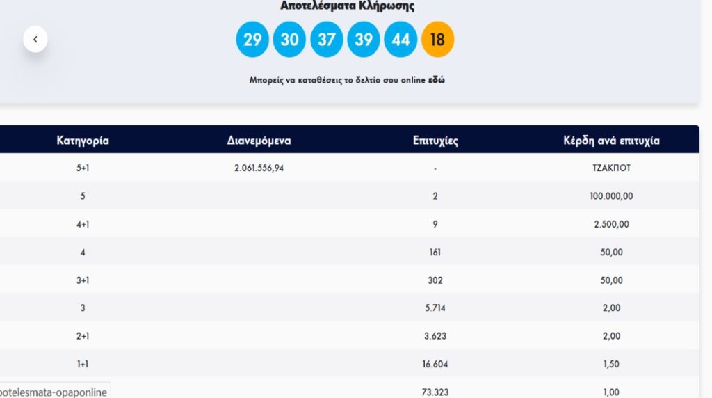 Οι τυχεροί αριθμοί ήταν οι: 29, 30, 37, 39, 44 και τζόκερ το 18.