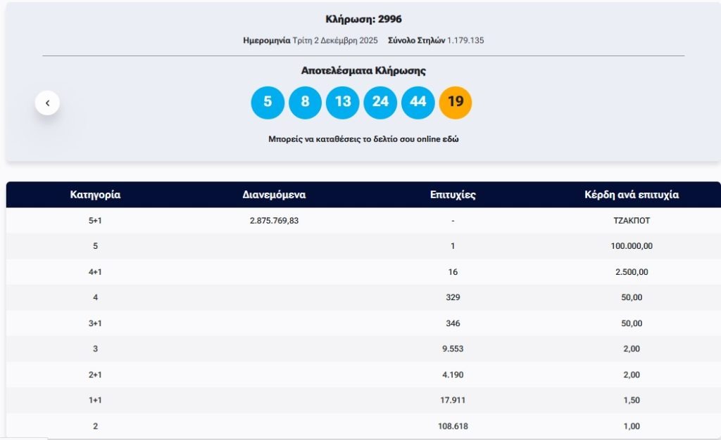 Ολοκληρώθηκε η σημερινή (2.12.2025) κλήρωση (υπ. αριθμ. 2996) του ΤΖΟΚΕΡ του ΟΠΑΠ.