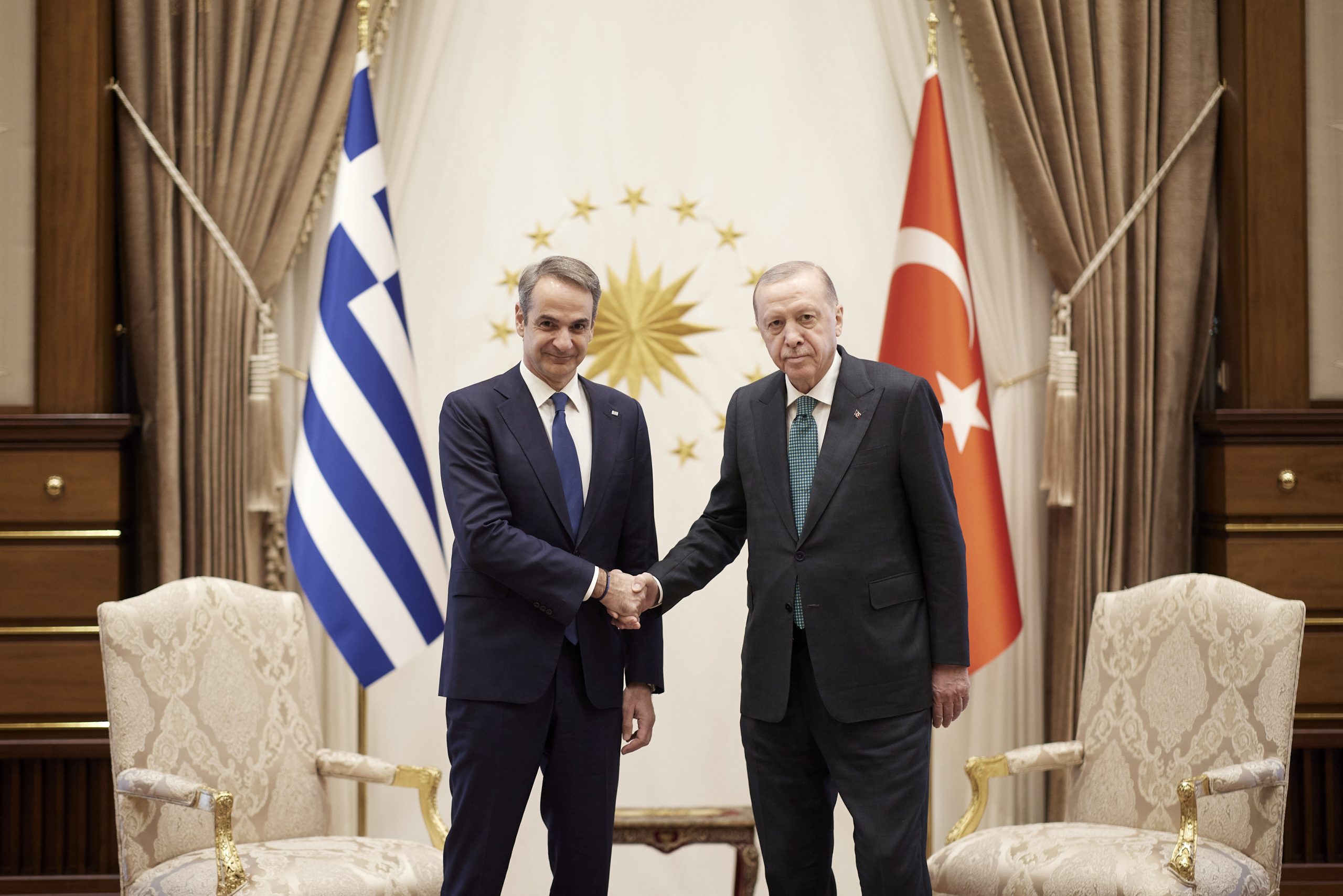 Στο Λευκό Παλάτι στην Άγκυρα έφθασε λίγα μετά τις 15:00 ο πρωθυπουργός Κυριάκος Μητσοτάκης. Εκεί τον υποδέχθηκε ο Τούρκος πρόεδρος Ταγίπ Ερντογάν και στις 15:15 ξεκίνησε η κατ’ ιδίαν συνάντηση.